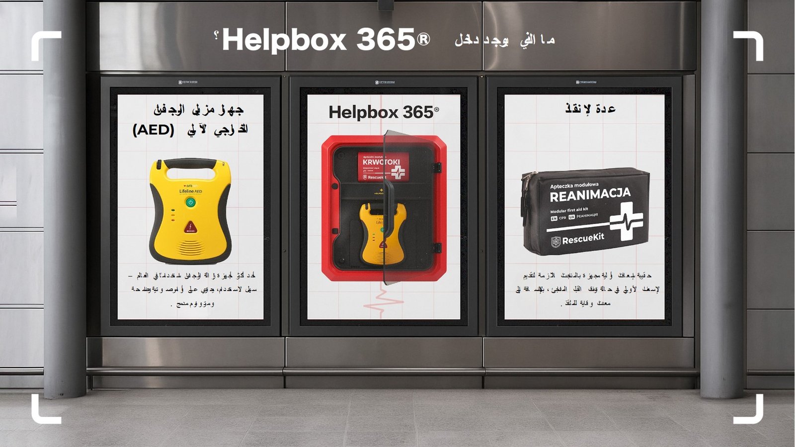 محطة HelpBox 365® هي محطة مبتكرة مزودة بجهاز إنعاش قلبي رئوي (AED) ومجهزة لإنقاذ الأرواح في الحالات الحرجة، سواء كانت سكتة قلبية أو إصابة خطيرة أو حريق.
